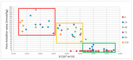 Based on the good correlation between self-diffusion (D) and aldehyde para-anisidine values (PAV), the linseed oil samples of the present thermal oxidation experiment appeared to form three groups, divided into green, yellow, and red, of oxidized molecular categories (Figure 3). The green group included non-oxidized safe oils with a D range of 0.036–0.047 × 10−9 m2/s and a PAV range of 0–40 mmol/kg; the yellow group included partially oxidized medium oils with a D range of 0.026–0.035 × 10−9 m2/s and PAV range of 40–150 mmol/kg; and the red group included highly oxidized unsafe oils with a D range of 0.012–0.025 × 10−9 m2/s and a PAV range of 90–220 mmol/kg. It should be noted that there were some outlier values that seem to have been due to experimental and/or analytical errors.