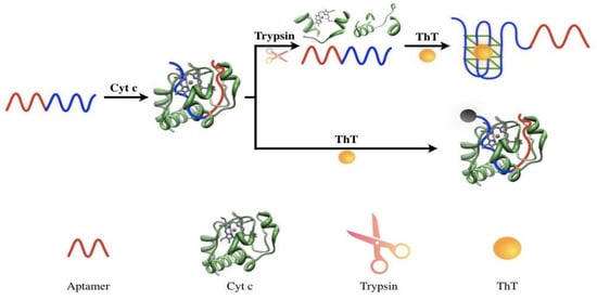 The principle of this assay is depicted in Figure 1. In this study, a DNA aptamer with high specificity to cyt c was selected through SELEX and then sequenced, synthesized, and characterized [48]. After the addition, the specific DNA aptamer quickly combined with cyt c (due to its high molecular weight). Subsequently, the steric hindrance prevented the linkage between ThT and the G-quadruplex part of the DNA aptamer, thus significantly reducing the fluorescence. In the detection system, trypsin can cleave cyt c into small peptide fragments, thus reducing the steric hindrance against the linkage and restoring the fluorescence. By measuring the degree of fluorescence recovery, the amount of trypsin can be determined.