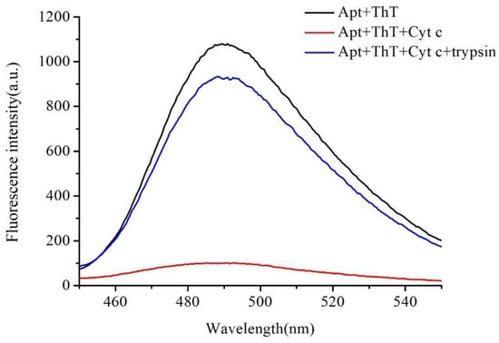The proposed method can detect strong levels of fluorescence at 490 nm of excitation from the G-quadruplex structure, which was formed by the association between the DNA aptamer and the ThT in buffer. However, no fluorescence was detected after the addition of cyt c, as the cyt c bonded to the DNA aptamer and prevented the formation of a G-quadruplex structure. The addition of trypsin restored the fluorescence. Trypsin cleaved the cyt c to small peptide fragments and assisted in the formation of a G-quadruplex structure (Figure 2). In summary, the results of this experiment demonstrated the feasibility of the proposed strategy for the determination of trypsin.