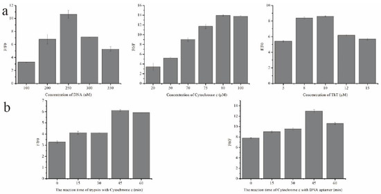 Different parameters influence fluorescence intensity during trypsin detection. Not only the concentration of each component but also the reaction time are critical factors for a desirable fluorescence response [56,57]. At first, the concentration range of the DNA aptamer was optimized between 100 nM to 350 nM. As shown in Figure 3a, the optimal concentration of the DNA aptamer was 250 nM. We then applied the 250 nM DNA aptamer in the assay to optimize the concentration of cyt c from 20 μM to 100 μM (a), and the ratio of the increase in fluorescence intensity reached a plateau at 80 μM of cyt c (Figure 3a). Under 250 nM of DNA aptamer and the 80 μM cyt c condition, the concentration of ThT was optimized from 5 μM to 15 μM, and the optimal concentration was achieved at 10 μM (Figure 3a). Figure 3b shows that the fluorescent intensity increased with the increased time for the reaction between trypsin and cyt c. The fluorescent intensity reached a peak after 45 min when the binding between trypsin and cyt c reached equilibrium and a saturation point. Moreover, 45 min was also a suitable hybridization time for cyt c, the DNA aptamer, and trypsin. Thus, 45 min was chosen as the incubation time for the reactions of cyt c with the trypsin and DNA aptamer.