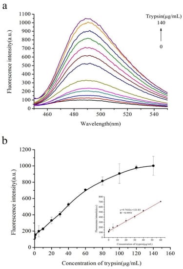 (a) Fluorescence emission spectra upon addition of trypsin at different concentrations, from 0 to 140 μg/mL. (b) Fluorescence signal in response to different concentrations of trypsin, showing the linear curve of the enhanced fluorescence intensity to the concentration of trypsin. The inset shows the linearity of the fluorescence intensity with respect to trypsin concentrations.