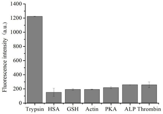 Selectivity of the assay. Selectivity of the proposed trypsin assay toward trypsin, HSA, GSH, Actin, PKA, ALP, and thrombin (60 μg/mL each).