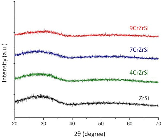 The XRD analysis revealed the amorphous nature of all the catalysts (Figure 2). Their diffraction patterns comprised only a halo at about 20–35°, typical for amorphous SiO2. No reflections of crystalline phases of ZrO2, SiO2, and chromium oxides were observed in the diffraction patterns. Therefore, only amorphous phases or very small crystallites can exist in the samples. The influence of silica on zirconia crystallization in the mixed ZrO2-SiO2 samples was reported earlier. Thus, modification of the tetragonal zirconia phase with silica decreased its crystallinity [26,27,28]. SiO2 prevented crystallization of ZrO2 in the SiO2–ZrO2 xerogel because the presence of Si–O–Zr bonds retarded the crystal growth upon calcination [29]. So, during the synthesis of our ZrSi and CrZrSi catalysts the structure of the Si-containing framework noticeably increased the rate of ZrO2·xH2O nucleation and slowed down further growth of nuclei and crystalline phase formation. Therefore, we may expect highly dispersed ZrO2 crystallites in the catalysts.