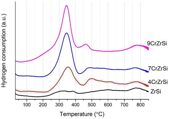 The bulk chemistry of the metal oxides in the catalysts was analyzed by TPR-H2 (Figure 3). This method is sensitive to the electronic state, particle size, component interaction, etc., and it can provide reliable information on the catalyst reducibility. ZrSi showed a very small hydrogen consumption that proceeded in two temperature ranges: from 200 to 400 °C and above 700 °C. The TPR profiles of all the Cr-containing samples also demonstrated a similar high-temperature peak that was obviously related to the reduction of Zr and/or Si species. Although in most cases bulk ZrO2 and SiO2 are not reduced in the studied temperature range, a small hydrogen uptake above 600 °C can be observed in the TPR-H2 profiles of zirconia [31,32].