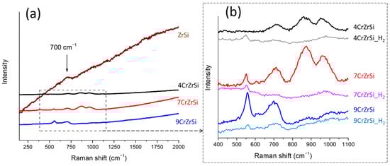 The structures of the CrZrSi catalysts were analyzed by Raman spectroscopy. The Raman spectra of ZrSi and the Cr-containing samples are presented in Figure 4. The rise of the background level caused by silica luminescence [37] is especially pronounced for the ZrSi sample. According to the literature data, this effect becomes stronger when increasing the silica dispersion [38]. No lines characteristic for zirconia crystalline phases [39] or SiO2 [40] were observed in the spectra. This fact points to the amorphous state of Zr- and Si-containing phases, which agrees with the XRD data. Only a weak signal at about 700 cm−1 is visible in the ZrSi spectrum (Figure 4a). Little information can be found in the literature concerning this Raman band. The band of symmetric bending vibrations in Si–O–Si linkages is located at lower wavenumbers of 660 cm−1 [41]. A broad band at 700 cm−1 in the spectra of crystalline zirconia was attributed to the disorder in the O sublattice induced by the large number of O vacancies [42]. Therefore, a similar band in the Raman spectra of ZrSi points to highly dispersed ZrO2 crystallites.