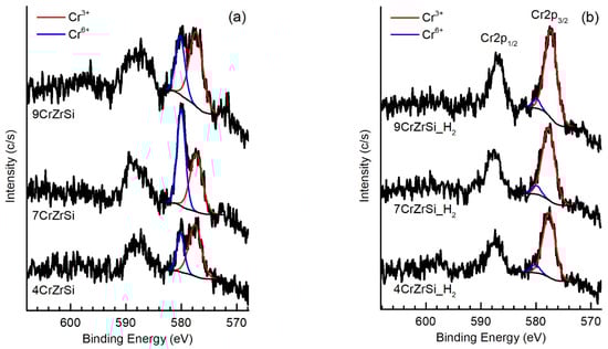 The Cr2p XPS spectra of the reduced Cr-containing catalysts did not show any signs of X-ray-induced degradation (see, for example, the spectra of 7CrZrSi_H2 in Figure S3b in the Supplementary Materials). These spectra mainly show the contribution from Cr3+ species (Figure 5b). Though fitting of these spectra demonstrated the presence of a small fraction of Cr6+ species (6–8%, Table 2), these values are below the detection limit of Cr6+ species (10% [56]). Therefore, the XPS data confirm the transformation of Cr6+ species into Cr3+ ones under reductive treatment at 550 °C, as was proposed from the TPR-H2 and Raman spectroscopy data. No significant changes in the surface Cr/Zr molar ratios were observed in the catalysts after H2 treatment. This result contradicts the assumption that the decrease in the intensity of Raman spectra after H2 treatment is caused by the depletion of the surface with chromium. So, the Cr6+ reduction to Cr3+ under reductive treatment at 550 °C did not lead to sintering and formation of large crystals.