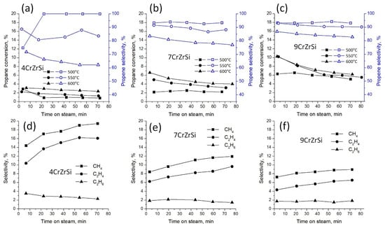 The modification of ZrSi with chromium and the increase in its loading from 4 to 9 wt.% noticeably enhanced the catalyst performance. The increase in the reaction temperature from 500 to 600 °C increased the propane conversion (Figure 6a–c), but the degree of the increase depended on the chromium content in the catalyst. The effect of the reaction temperature on the propane conversion was more pronounced for 4CrZrSi and 7CrZrSi. The propane conversion over 9CrZrSi was about 6% at 500 °C and about 10% both at 550 and 600 °C. The selectivity to propylene S(C3H6) strongly (by 40%) decreased for 4CrZrSi with increasing temperature, but less pronounced decreases of 13 and 9% were observed for 7CrZrSi and 9CrZrSi (Figure 6a–c).
