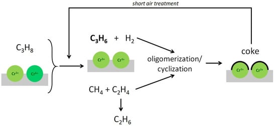 The activity of Cr-containing catalysts in PDH is often associated with the presence of highly dispersed α-Cr2O3, while its large crystallites are inactive [57]. Oxide supports can improve the dispersion of Cr2O3, making crystallites smaller. Additionally, the redox species provided by the ZrO2 or Al2O3 support are expected to play an important role [20,23,58]. Coordinatively unsaturated Zr4+ sites in the CrOx/ZrO2 catalysts can serve as additional active centers providing synergistic action of Cr and Zr in non-oxidative PDH [20,21]. For example, a synergistic effect of CrOx and coordinatively unsaturated Zr4+ centers was observed in the CrOx/LaZrOx catalyst in PDH [20]. It was proposed that ZrO2-based catalysts (LaZrOx or YZrOx) have their own catalytic activity in PDH due to the combination of coordinatively unsaturated zirconium cations (Zrcus4+) and neighboring lattice oxygen [21]. Zr-C3H7 and O–H species are formed after the breakage of C–H bonds in C3H8. At the next stage, hydrogen is desorbed from the surface to form propylene.