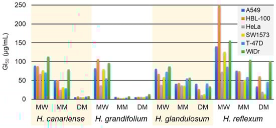 Following the guidelines of the NCI, the antiproliferative activity of the 12 microextracts (MW, MM and DM) obtained from the aerial parts of H. canariense (CMW, CMM and CDM), H. glandulosum (GMW, GMM and GDM), H. grandifolium (LMW, LMM and LDM), and H. reflexum (RMW, RMM and RDM) were evaluated against six human tumor cell lines: A549, HBL-100, HeLa, SW1573, T-47D and WiDr. The maximum test concentration was set at 250 µg/mL, according to NCI guidelines [49,50]. The results, expressed as 50% growth inhibition (GI50), are given in Figure 2 (Table S1). According to NCI calculations, GI50 values represent approximate values. Taken as a whole, the GI50 values enabled an arrangement of the plants in the following decreasing order of activity: H. grandifolium > H. canariense > H. glandulosum > H. reflexum. Our results are in agreement with a previous study where the antiproliferative activity of essential oils and polar extracts (methanol—acetone 1:1) from the aerial parts of H. canariense, H. grandifolium and H. reflexum were evaluated against the human tumor cell lines A375 (malignant melanoma), MDA-MB-231 (breast adenocarcinoma) and HCT116 (colon carcinoma) [42]. In that study, the polar extract from H. grandifolium also exhibited a significant antiproliferative activity and resulted the most active one. Noteworthy, our work represents the first study reporting antiproliferative activity of H. glandulosum extracts.