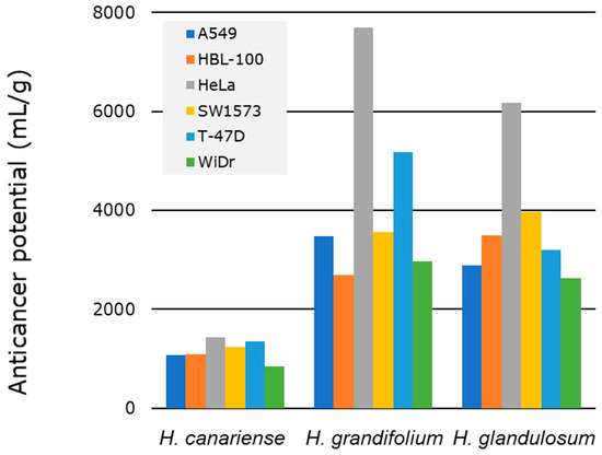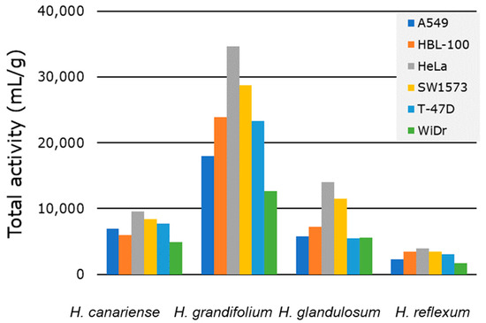 Since our protocol involves the sequential extraction using three solvent systems (Figure 1), we considered appropriate to compute the TA for each individual extract and sum all the TAs corresponding to a virtual total extract from each plant and each cell line. With this calculation, each TA value represents a theoretical activity of each theorical total extract against each cell line that complies with the definition provided by Eloff [11]. Therefore, Figure 3 (Table S2) collects the TA for each of the plant species against each of the six cell lines tested. The results enabled ordering the species according to decreasing values of TA: H. grandifolium > H. glandulosum > H. canariense > H. reflexum.