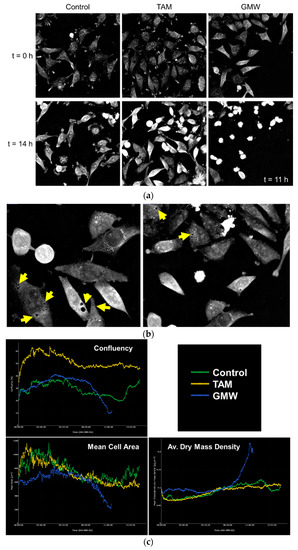 HeLa cells were exposed to GMW and the effects were monitored for 15 h. For comparison purposes, we used TAM. Figure 7 depicts how GMW is able to induce death to HeLa cells earlier and in extended populations than TAM (Figure 7a). In consonance with AO staining results (Figure 5), cells are highly vacuolated (Figure 7b) in the GMW-treated group. This feature could be induced not only by the pharmacological activity of the extract but as a cell response to an external agent, trying to isolate the exogenous substances. Since live imaging has enabled us to observe cell death progressively, we can differentiate several apoptotic hallmarks. Treatment with GMW induced nuclear condensation and cell shrinkage after 10 h of incubation in a broader way than TAM. For the same time period, cell death was not observed in the control group (Figure 7a, Supplementary material V1). The observed effects were analyzed and quantified with STEVE software (Figure 7c, Figures S2–S4). Cell death is represented as a drastic decrease in the percentage of confluence in the GMW-treated samples. The formation of apoptotic bodies by cell shrinkage is depicted in the diminished cell area. In agreement with this last result, dry mass density is increased in the GMW-treated cells when compared to the control, reflecting the collapsing of cells caused by the extract.