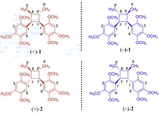 As lignans, no more than 200 7,7′-cyclolignans have been identified in nature, which are mainly reported from the Labiatae [19,20,21], Asteraceae [22,23], Piperaceae [24,25] and Ginkgoaceae families [26]. In total, Labiatae accounts for less than 30 compounds. Two pairs of 7,7′-cyclolignan enantiomers, (±)-perfrancin (1) and (±)-magnosalin (2), were separated from the leaves of P. frutescens. Perfrancin has been reported only once before in organic synthesis [14], and this is the first report of perfrancin from natural plants. Magnosalin has been isolated from Magnolia salicifolia [27], Piper sumatranum [24] and P. frutescens [11]. However, absolute configurations of these compounds have not been determined. In the current study, we found that two pairs of lignan enantiomers were further separated through chiral HPLC separation, and compounds’ absolute configurations were successfully determined by X-ray diffraction analyses and ECD calculations.