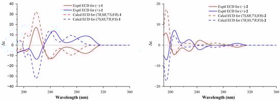 Further analysis of the HSQC, 1H,1H-COSY, HMBC and NOESY data confirm the planar structure and relative configuration of compound 1. Interestingly, no cotton effects are observed in its ECD spectrum, which indicates that 1 might be isolated as a racemic mixture. Subsequently, compound 1 was further enantioseparated on a chiral column to afford (+)-1 and (−)-1. Their absolute configurations were identified as (+)-(7S,8S,7′R,8′S)-1 and (−)-(7R,8R,7′S,8′R)-1, based on experimental and calculated ECD data (Figure 2 and Supplementary Materials). Enantiomers are labeled (−)-perfrancin and (+)-perfrancin.