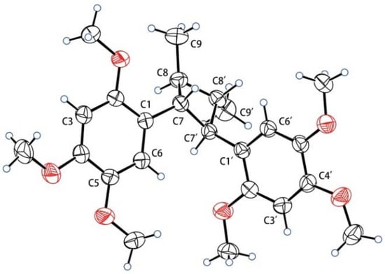 Compound 2 was obtained as a colorless crystal. It has a molecular formula of C24H32O6, as indicated by HRESIMS at m/z 439.2092 [M + Na]+ (calcd. for C24H32O6Na, 439.2097). The 1H and 13C NMR spectra of 2 display the same resonances as those of magnosalin, which was confirmed to have a small negative optical rotation { −4.64 (c 0.25, CHCl3)} [11]. Moreover, magnosalin’s absolute configuration has not been ascertained. Interestingly, X-ray diffraction data analysis of compound 2 (Figure 3) suggests that it contains two racemates. The (+)-2 and (−)-2 enantiomers successfully obtained by chiral HPLC separation display obvious specific optical rotation {(−)-2: –21.2 (c 0.10, MeOH), −33.8 (c 0.07, CHCl3); (+)-2: +23.0 (c 0.05, MeOH), +37.4 (c 0.05, CHCl3)}. Their absolute configurations were determined via ECD calculations. As shown in Figure 2, the absolute configuration of (+)-2 is identified as 7R,8S,7′R,8′S based on the good agreement with the calculated ECD spectrum of (7R,8S,7′R,8′S)-2, naturally elucidating the absolute configuration of (−)-2 as (7S,8R,7′S,8′R)-2. Consequently, the latter configuration (7S,8R,7′S,8′R) is clarified as the reported compound (−)-magnosalin [11], whereas the former one (7R,8S,7′R,8′S) corresponds to an unreported compound labeled (+)-magnosalin.
