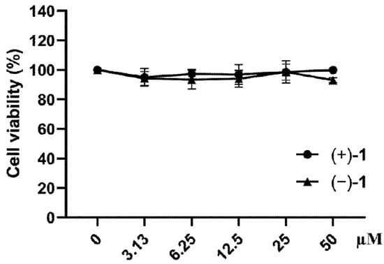 Cytotoxicity of compounds (+)-1 and (−)-1 was investigated by measuring cell viability. As shown in Figure 4, compounds (+)-1 and (−)-1 exert no cytotoxicity on RAW 264.7 macrophages at 3.13, 6.25, 12.5, 25 and 50 μM. Therefore, compounds (+)-1 and (−)-1 at 3.13–50 μM were used in subsequent experiments.