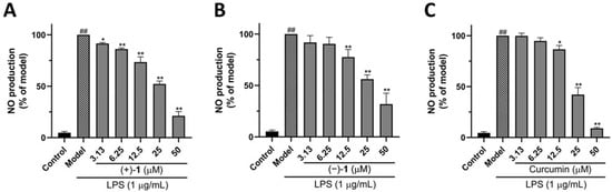 The inhibitory effect of compounds (+)-1 and (−)-1 against LPS-induced NO production on RAW 264.7 cells. (A) Compound (+)-1 reduced the production of NO. (B) Compound (−)-1 reduced the production of NO. (C) Curcumin reduced the production of NO. Values are presented as mean ± SEM of three independent experiments. ## p < 0.01 vs. control group, * p < 0.05, ** p < 0.01 vs. model group.