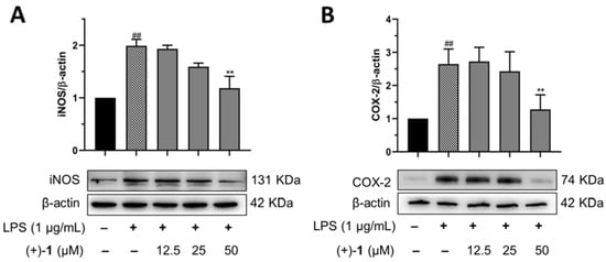 Many critical enzymes are related to the establishment and progression of inflammation, including iNOS and COX-2 [17,18]. We carried out Western blot analysis on LPS-treated RAW 264.7 macrophages with or without compound (+)-1 to determine protein expression levels. LPS treatment at 1 µg/mL for 24 h markedly increased iNOS (p < 0.01, Figure 7A and Table S3) and COX-2 (p < 0.01, Figure 7B and Table S3) protein expression, in comparison with the control group. Compound (+)-1 treatment significantly reversed the increased expression of iNOS (p < 0.01) and COX-2 (p < 0.01) at 50 μM in RAW 264.7 macrophages activated by LPS.