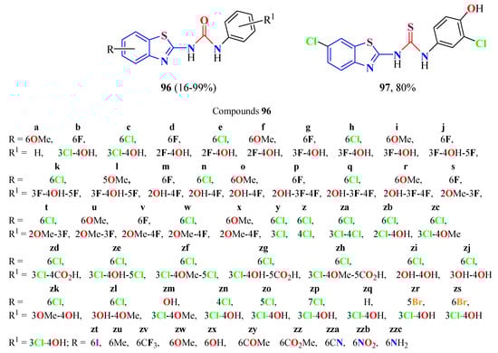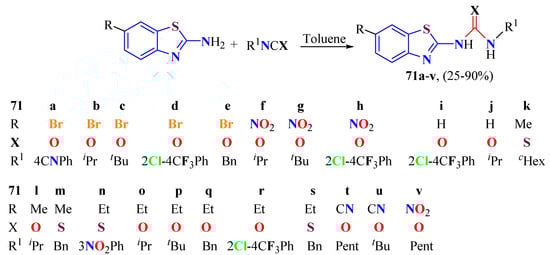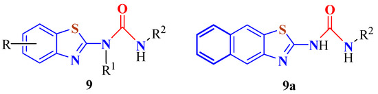 Later, the respective 2ABT or 2-N-alkyl-ABT were treated with an alky- or aryl-iso(thio)cyanate or carbamoyl chloride in an aprotic solvent to yield around 81% of the urea compounds 9, Figure 2 [110]. Refluxing toluene for 4 h was used in the case of substituted-aryl-UBTs and refluxing tetrahydrofuran (THF) for 6 h in the case of substituted-aryl-UBTs. All compounds were tested for immunosuppression in the sheep erythrocyte assay in mice and for antiviral activity against Coxsackie A21 (Coe) virus infection in mice. The most potent immunosuppressant was substituted ureanaphtothiazoles 9a. One of them was 250 times more active as azathioprine in the sheep erythrocyte test in mice. R2 must be an aryl group to be active. For R1 = H, the best R2 aryl groups were the halogen substituted pClPh, mClPh, and oFPh. In the immunosuppressive structure–activity relationship (SAR), the best activity was observed for R groups in the 4th position on the BT ring, for example, 4Cl is even active when R2 is cyclohexyl. When R1 = Me, the potency decreases to the 50 mg/kg range. In antiviral SAR, the antiviral activity showed to be dependent on the nature of R2: if, for example, in R2 = 1-naphthyl, adamantyl, and aryl groups, the compounds are quite active.