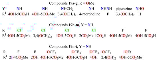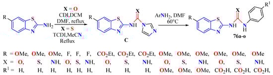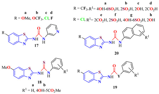 A series of 45 different 6-substituted-aryl-UBTs 17, 19, and 20 and 6-substituted-aryl-TBTs 18 were synthesized from the reaction of the corresponding 6-substituted-2ABT with CDI or TCDI in stirring CH3CN at room temperature, then reacted with amines in DMF on heating 100 °C, Figure 3 [125]. Using an ELISA-based screening assay, the Frentizole SAR was identified as a novel UBT inhibitor of the interaction of amyloid beta peptide (Aβ) and Aβ-binding alcohol dehydrogenase (ABAD) [Aβ-ABAD], recently implicated in the pathogenesis of Alzheimer’s disease (AD), with a 30-fold improvement in potency. In summary, all synthetized compounds were identified as micro molar inhibitors of the Aβ-ABAD interaction. The compounds 19h and 19l showed the most potent inhibition with IC50 values of 6.46 and 6.56 μM, respectively.