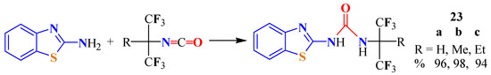 The 1,1-bistrifluoromethyl-1-alkyl-UBTs 23a–c was prepared by addition of 2ABT to the corresponding bis-fluoroalkyl-isocyanates, Figure 4 [129]. These UBTs were evaluated for their in vitro antiproliferative activities against the human cancer cell lines. The most sensitive cell lines relative to the tested compounds were: 23c SNB-75 (CNS cancer, log GI50 = 5.84) and 24b UO-31 (renal cancer, log GI50 = 5.66), and SR (leukemia, log GI50 = 5.44) human cancer cells.