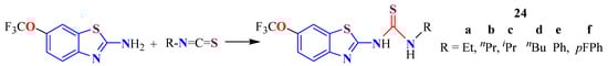 A series of 6-trifluoromethoxy-TBTs 24a–f from 6-trifluoromethoxy-2ABT (Riluzole), a neuroprotective drug in many animal models of brain disease have been synthesized, Figure 5 [130]. The biological activity of synthetized TBTs was preliminarily tested by means of an in vitro protocol of ischemia/reperfusion injury. The results demonstrated that 24a–d significantly attenuated neuronal injury. Selected for the testing of their antioxidant properties, compounds 24a–d were shown to be endowed with a direct reactive oxygen species (ROS) scavenging activity. Compounds 24a and 24b were also evaluated for their activity on voltage-dependent Na+ and K+ currents in neurons from rat piriform cortex. At 50 μM, compound 24b inhibited the transient Na+ current to a much smaller extent than Riluzole, whereas 24d was almost completely ineffective.