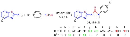 The appropriate 4/6-arylsubstituted-2ABT and the respective aryl-isothiocyanate was reacted in a mixture of DMAP (5 mol %) in DMF to furnish 6/4-arylsubstituted-TBT derivatives 33a–l in 83–91% yield, Figure 6 [115]. All compounds were evaluated for cytotoxic activity against two human monocytic cell lines (U 937, THP-1) and a mouse melanoma cell line (B16-F10). Based on their IC50 values, almost all compounds had significant antiproliferative activity on U 937 and B16-F10 cells, with 33b, 33e, 33f, 33k, 33c, and 33h being the most actives. Compound 33e demonstrated to have the best antiproliferative activity against the U-937 cell line. The IC50 values of compound 33e were higher (16.23 ± 0.81 μM), (47.73 ± 2.39 μM), and (34.58 ± 1.73 μM) as compared to standard compound etoposide IC50 values (17.94 ± 0.89 μM), (18.69 ± 0.94 μM), and (2.16 ± 0.11 μM)) against U-937, B16-F10 and THP-1 cell lines, respectively.