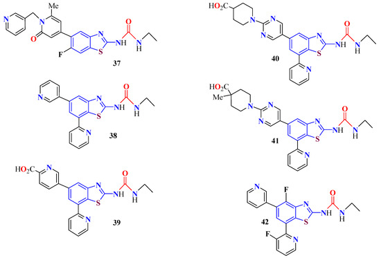 Compound 38 exhibited important inhibitory activity against S. aureus GyrB (IC50 0.014 μg/mL) and strong antibacterial activity against VR E. faecalis, VR E. faecium, FQR S. pneumoniae, S. aureus, and M. catarrhalis with a MIC value of less than 25 μg/mL. The solubility and antimicrobial profiles of 39 were improved at physiological pH from 6.25 μg/mL to 50 μg/mL by bonding a carboxylic acid on pyridine group (39), while maintaining antibacterial activity against target pathogens (S. aureus GyrB IC50 0.001 μg/mL, E. faecalis MIC 0.12 μg/mL). In addition, benzothiazole ethyl ureas 40 and 41 were synthesized by changing the carboxylate in compound 38 by a cyclic amine [78,79]. Both compounds inhibited the turnover of ATP by both the DNA gyrase and topoisomerase IV enzymes, with mean IC50s ranging from 0.0033 μg/mL to 0.046 μg/mL. These compounds were also tested against six major Gram-positive pathogens, exhibiting potent inhibition with MIC90 values from 0.015 μg/mL for S. pneumoniae to 0.25 μg/mL for S. aureus, compared with the MIC90 values of 2 μg/mL and 4 μg/mL, respectively, for linezolid and 16 μg/mL and 16 μg/mL, respectively, for levofloxacin. The tested compounds were also potent against S. aureus drug-resistant strains, including VRE, MRSA, VRSA, linezolid-non-susceptible S. aureus, daptomycin-non-susceptible, methicillin-resistant S. epidermidis, penicillin resistant S. pneumoniae, and FQ-S. pneumoniae strains. Moreover, no cross-resistance was observed caused by the mechanisms responsible for conferring resistance to these antibiotics. Both compounds also showed a promising pharmacokinetic profile in rats and mice [78].