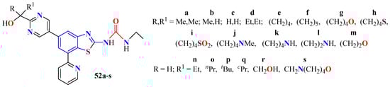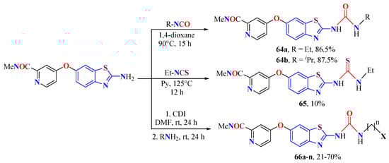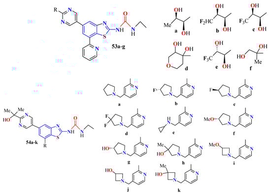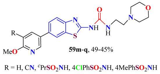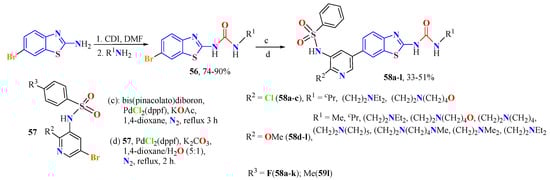 The 6-bromo-2ABT was reacted successively with CDI and substituted ethylamine to yield 6-bromo ethyl-UBTs 56 in 74–90%, Scheme 19 [148]. Intermediates 56 were reacted successively with bis(pinacolato)diboron and intermediate 57, catalyzed by PdCl2(dppf), to yield a series of 6-(2,3-disubstituted pyridine-5-yl)-ethyl-substituted-UBTs 58a–l in 33–51%. The antiproliferative activities of the synthesized compounds in vitro were evaluated against HCT116, MCF-7 U87MG, and A549 cell lines. The compounds with potent antiproliferative activity were tested for their acute oral toxicity and inhibitory activity against PI3Ks and mTORC1. The results indicate that the compounds with R1 = 2-dialkylaminoethyl moiety 58b, 58f, 58k, and 58l retain the antiproliferative activity and inhibitory activity against PI3K and mTOR. In addition, their acute oral toxicity reduced dramatically. Moreover, compound 58f can effectively inhibit tumor growth in a mouse S180 homograft model. These findings suggest that derivatives 58f, 58k, and 58l can serve as potent PI3K inhibitors and anticancer agents with low toxicity.