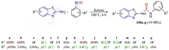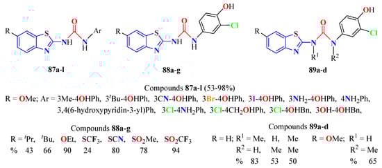 - Kaufmann, H.P. Arzneimittelsynthetische Studien IX: Benzthiazolylharnstoffe. Mitbearbeitet von P. Schulz. Arch. Pharm. 1935, 273, 31–52. [Google Scholar] [CrossRef]