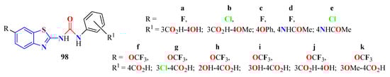 In a typical reaction, ortho-, meta-, or para-tolyl-isocyanates were treated with 2ABT in the presence of 1,4-dioxane at room temperature to synthetize three tolyl-UBTs 55a–c to evaluate their inhibitory effects on α-chymotrypsin enzyme, Figure 9 [147]. It was found the para-substituted N-(1,3-benzothiazol-2-yl)-N′-(4-methylphenyl) urea 55c derivative substantially inhibited α-chymotrypsin activity (IC50 = 20.6 ± 0.06 μM). Due to the presences of the bulky 1,3-benzothiazol-2-yl group at one nitrogen of the urea bridge, the activity is enhanced by the reduction of the steric hindrance in the order ortho > metha > para.