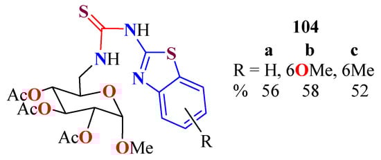 Several substituted-hepta-O-acetyl-β-D-lactosyl-TBTs 16 were prepared in 64–90% by the condensation of hepta-O-acetyl-β-D-lactosyl-isothiocyanate with substituted-2ABTs, Scheme 7 [124]. The structures of these new lactosyl-TBTs have been established on the basis of IR, NMR, and mass spectral studies.