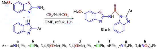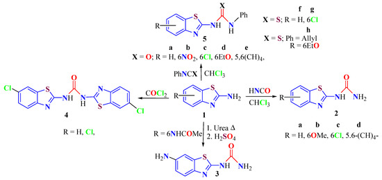 In 1935, for the first time, Kaufmann synthesized several substituted UBTs 2–3, bis-6-chloro UBT 4, substituted phenyl-UBTs 5a–e, and substituted phenyl-TBTs 5f–h from the reaction of the corresponding substituted 2ABTs with urea, cyanic acid, phosgene, benzene-isocyanate, and –thiocyanate in chloroform as solvent, Scheme 1 [107].