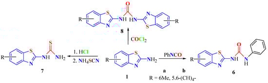 - Abdel-Rahman, H.M.; Mohamed AMorsy, M.A. Novel benzothiazolyl urea and thiourea derivatives with potential cytotoxic and antimicrobial activities. J. Enzym. Inhib. Med. Chem. 2007, 22, 57–64. [Google Scholar] [CrossRef] [PubMed]