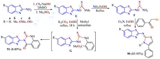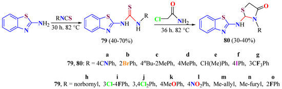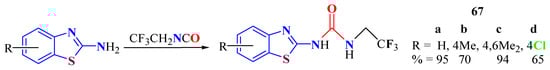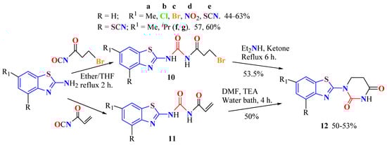 In 1973, 4,6-disubstituted-β-bromo-propyl-UBTs 10a–g and 4,6-disubstituted-ethenoyl UBTs 11a–g were prepared from the reaction of 4,6-disubstituted-2ABTs with β-bromo-propionyl-isocyanate to be cyclized to produce l-(4,6-disubstituted-benzothiazol-2-yl) dihydrouracils 12, Scheme 3 [118]. A mixture of ether/THF was used for 10a,f,g or THF for 10b–e. The reaction mixture refluxed for 2 h. All compounds were shown to have antibacterial, antifungal, and antiprotozoal in vitro effects. The minimal inhibition concentration of 6-thiocyanate-β-bromo-propionyl-UBT 10f was 50 μg/mL for all tested organisms, which represent a high efficiency.