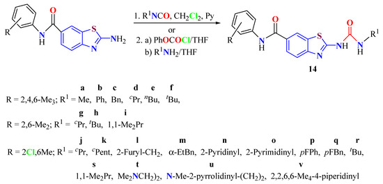 A series of 6-substitutedUBTs 14 inhibitors of p56lck were prepared to elucidate their SAR, selectivity, and cell activity in the T-cell proliferation assay, Scheme 5 [122]. The urea derivatives 14 were prepared from the corresponding 6-substituted 2ABT when treated with an alkyl- or aryl-isocyanate in dichloromethane and pyridine to form UBTs 14. Alternatively, the 6-substituted-2ABTs treated with phenyl chloroformate in aqueous THF in the presence of potassium bicarbonate in the form of a phenyl carbamate, which is treated with an amine in THF form the ureas 14. Compound 14r was found to be a potent and selective Lck inhibitor with good cellular activity (IC50 = 0.004 μM) against T-cell proliferation.