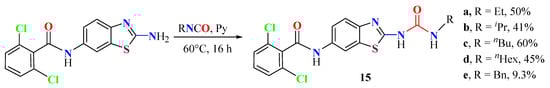 A series of 6-(2,6-dichlorobenzoamidyl)-alkyl-UBTs 15 was prepared from the reaction of N-6-(2,6-dichlorobenzoamidyl)-2ABT with the corresponding alkyl-isocyanate in pyridine as a dissolvent at 60 °C for 16 h, Scheme 6 [123]. The cytotoxicity text results of all compounds against tumorigenic cell lines were shown. The UBT derivatives 15a–e had the same potency as the amide or urethane derivatives. Selective cytotoxicity against a tumorigenic cell line, WI-38 VA-13 subline 2RA (VA-13), was observed, but not against the normal parental cell line, WI-38. EC50 (ng/mL): 15a = 32, 15b = 30, 15c = 28, 15d = 290, and 15e = 150.