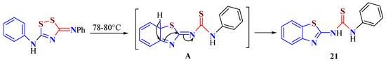 The phenyl-TBT 21 has been isolated from thermal transformation of 3-phenylamino-5-phenylimino-1,2,4-dithiazole via intramolecular rearrangement through intermediate A, Scheme 8 [126]. Analogous thermal or acidic catalyzed rearrangements have been described [127].