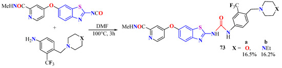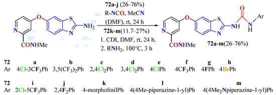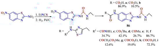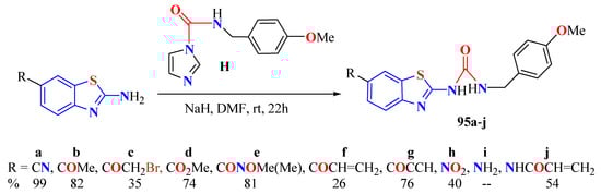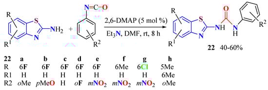 A series of aryl-UBTs 22 has been synthesized in 40–60% yield from the reaction of the substituted 2ABT with the corresponding aryl-isocyanate in presence of N,N′-dimethylformamide (DMF), triethylamine (TEA), and dimethylaminopyridine (DMAP) stirring for 8h at room temperature, Scheme 9 [128]. The resultant compounds were evaluated for their antiproliferative profiles in human SK-Hep-1 (liver), MDA-MB-231 (breast), and NUGC-3 (gastric) cell lines. Compounds 22e, 22g, and 22h had the potential to moderate inhibitory activities. More of these compounds have been investigated for their ability to inhibit Raf-1 activity. However, they exhibited moderate to poor inhibition.