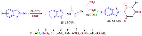 Some 4/6-substituted-phenyl-TBTs 25 were synthesized by the reaction of substituted-2ABT with the corresponding substituted phenyl-isothiocyanate in absolute ethanol, Scheme 10 [131]. Compounds 25 were condensed with malonic acid in acetyl chloride to obtain 1-(4/6-substituted-BT-2-yl)-3-phenyl-2-thiobarbituric acid derivatives 26. All the synthesized compounds were characterized by elemental analysis, infrared (IR), hydrogen nuclear magnetic resonance 1H NMR, and Mass spectral studies. Compounds 25 and 26 were screened for their entomological and antibacterial activities. All the synthesized compounds were screened for antibacterial activity at a concentration of 200 μg/mL and 100 μg/mL in DMF using streptomycin and ceftazidime as standard against Gram positive and negative bacteria. Among the synthesized compounds, 26a, 26f, and 26g compounds were found to possess broad-spectrum activities. However, the activities were much less than those of standard antibacterial agents used. These compounds also showed potent antiulcer, anti-inflammatory, and antitumor activities as well as antifeedant activity and acaricidal activity against Spodoptera litura and Tetranychus urticae, respectively. From the results, these compounds would be better used in drug development to combat bacterial infections and would be better used as antifeedant and acaricidal activities in the future as well.