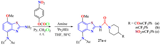 Firooznia et al., synthesized three 4,7-disubstituted-piperidine UBTs 27a–c from the reaction of the 4,7-disubstituted-2ABT with para nitro phenyl chloroformate, followed by the displacement of p-nitro-phenol with an appropriately substituted amine, Scheme 11 [132]. The synthesized compounds were evaluated for their selectivity against the A2A and A1 receptors. Antagonists of the A2B receptor were used as potential therapeutic agents in models of diabetes, asthma, chronic obstructive pulmonary disease (COPD), and pulmonary fibrosis. Compound 27c displayed excellent A2B potency, as well as good A2A and A1 selectivity, IC50 (A2B cAMP) = 20 nm, Ki (A1 binding) = 690 nm, and Ki (A2A binding) = 530 nm. A SAR study revealed that compounds with urea derivatives, enhance A2B potency.