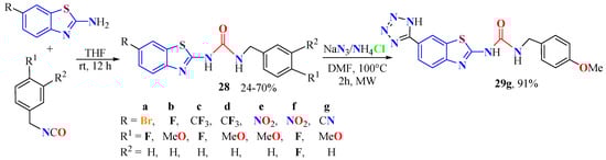The 6-substituted-benzyl UBTs 28a–g were synthetized from the reaction of 6-substituted-2ABT with the in situ generated substituted benzyl-isocyanates obtained from the benzylamine and triphosgene, Scheme 12 [133]. To improve yields, n-butyl-lithium was used to activate 2ABT (24–70%). In the case of 28g (R = CN), the 6-tetrazole p-methoxybenzyl-UBT 29g was obtained in 91% using sodium azide NaN3 in microwave radiation. All compounds were evaluated for their inhibition of glycogen synthease kinase-3 (GSK-3) activity. Several compounds were identified to reduce in vitro GSK-3β activity beneath 50% at a concentration of 10 μM. The SAR of the library justified the synthesis of the UBT 29g (IC50 = 140 nM), which displayed more than twofold enhanced activity compared with the reference compound 1-(4-methoxybenzyl)-3-(5-nitrothiazol-2-yl)urea (AR-A014418: IC50 = 330 nM).
