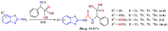A series of sixteen differentially substituted-(phenyl)-methyl-phosphonate-TBTs 30a–p were synthetized from substituted 2ABTs and O,O′-di-alkyl-isothiocyanate-(phenyl)methyl-phosphonates in heating dry CH3CN at 90 °C in 30 min under microwave irradiation with a power input of 120 W, Scheme 13 [134]. The products were obtained in good to excellent yields (40–81%), shorter reaction times, milder reaction conditions, and simple purification procedures. The compounds possessed broad-spectrum insecticidal and antiviral activities against Tobacco Mosaic Virus (TMV) in vivo. Two compounds, 30a (R1 = 6F, R = nPr) and 31l (R1 = OMe; R = nBu), had remarkably high in vitro insecticidal activities against Plutella xylostella compared with the control insecticide Avermectin. Furthermore, all were associated with moderate to good anti-TMV activities.