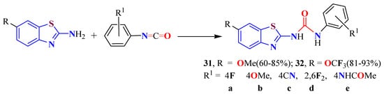 Caputo et al. synthesized two sets of 6-substituted Aryl-UBTs 31a–e and 32a–e by reacting substituted 2ABTs with aryl-isocyanates in dry dichloromethane at room temperature (31a–e, 60–85% and 32a–e, 81–93%) and evaluated in an in vitro primary anticancer assay against a panel of 60 human tumor cell lines, Scheme 14 [135]. Compounds 32a and 32c showed good anticancer activities, more marked for compound 32c. All compounds in a preliminary in vitro assay as inhibitors of the ubiquitin-activating enzyme (E1) lacked significant activity. The UBT scaffold 32c showed considerable growth inhibitory activities against different human tumor cell lines such as leukemia (log GI50 value −5.93), non-small cell lung (log GI50 value −6.0), colon cancer (log GI50 value −5.89), CNS cancer (log GI50 value −5.73), melanoma (log GI50 value −5.89), ovarian cancer (log GI50 value −5.74), renal cancer (log GI50 value −5.90), prostate cancer (log GI50 value −5.72), and breast cancer (log GI50 value −6.0) as compared with the reference drug 5-fluorouracil NSC 19893.