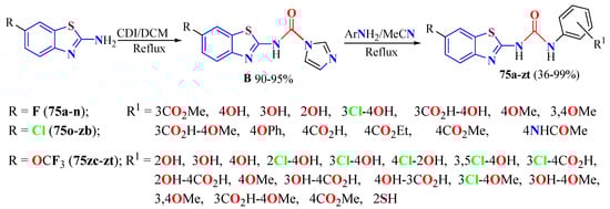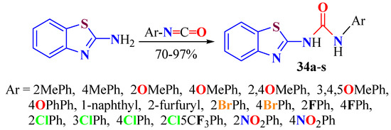 Azam and coworkers synthetized aryl-UBT derivatives 34a–s from the reaction of 2ABT in acetonitrile as dissolvent with the dropwise addition of the appropriate aryl-isocyanate stirred at room temperature until the completion of the reaction (1–4 h), Scheme 15 [136]. All compounds were tested as anti-Parkinsonian agents with an improved pharmacological profile in haloperidol-induced catalepsy and oxidative stress in mice. All compounds were active in alleviating haloperidol-induced catalepsyin mice. Furfuryl 34i and 2-methoxy 34c emerged as potent agents. With exception of 2-chloro, 5-trifluoromethyl-substituted analog 34q, and halogen substituted derivatives 34n–p exhibited moderate antiparkinsonian activity. Molecular docking studies of these compounds with adenosine A2A receptor exhibited very good binding interactions and warrants further studies to confirm their binding with human A2A receptor for the design and development of better therapy for Parkinson′s disease PD.
