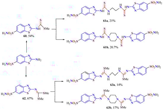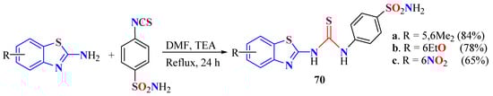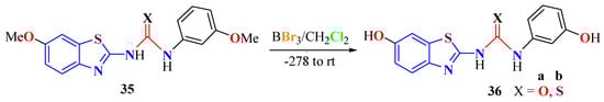 The 6-methoxy-m-methoxyUBTs 35a, 6-methoxy-m-methoxyTBTs 35b, and their hydrolyzed compounds 36a,b were synthesized via amide coupling starting from the reaction of 6-methoxy-2ABT with m-methoxy-benzo-isocyanate or m-methoxy-benzo-isothiocyanate in pyridine at 100 °C for 20 h, respectively, Scheme 16 [137]. The ether cleavage of the methoxy groups was carried out with boron tribromide (BBr3) in methylene chloride (CH2Cl2) at −278 °C to room temperature to yield compounds 36a and 36b. The three-unit bridge resulted in the inactive urea 36a against human 17β-hydroxysteroid dehydrogenase 1 (17β-HSD1), but the more lipophilic thiourea 36b showed a moderate inhibitory activity (70b: 62% inhibition at 1 µM).