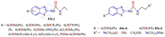 Since UBTs synthesized by Kauffmann in 1935 were found to be local anesthetics, potent hypoglycemics, and antibacterial agents, these kinds of compounds have had the interest of medicinal chemists [107,108,109,110]. For instance, Frentizole [6-methoxy-phenylureabenzothiazole], Figure 1, a non-toxic UBT drug (IC50 = 200 μM), was approved by the FDA for the treatment of rheumatoid arthritis and systemic lupus erythematosus and has been tested for the immunosuppressive and super-immunosuppressive dose levels on the resistance of the mice to viral infections, Figure 1 [111,112]. It was also found that the mean survival time of specific pathogen-free male mice pre-treated with Frentizole or Azathioprine at 100, 50 or 25 mg/kg and infected with herpes simplex and influenza virus was reduced. On the other hand, it is well known that the combination of UBT and TBT derivatives leads to inhibitors of DNA topoisomerase or HIV reverse transcriptase (e.g., III, Figure 1) [113,114,115]. In addition, the UBTs Bentaluron and Bethabenthiazuron (Tribunil or Ormet) are commercial fungicides used, respectively, as wood preservative and herbicide in winter corn crops [116,117].