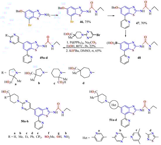 By using ethyl isocyanate in 1,4-dioxane at 80 °C overnight, the 5-OBn and 7-bromo-2ABT was transformed to the 5,7-disubstituted-ethylUBT 46 in 75% yield, subsequent pyridine-2-yl group was coupled to the C-7 to afford compound 47 in 70% yield, Scheme 18 [144]. Compound 47 was Bn-deprotected (97%), converted to the triflate (68%), and a Miyaura borylation reaction yielded 88% of the key borinic acid intermediate 48 for further derivatization through a Suzuki cross-coupling of the corresponding 5-bromo pyrimidine with 49, followed by saponification to yield 5,7-disubstituted-ethylUBTs 49a–d, 50a–h, and 51a–d, Scheme 18. The synthetized compounds were tested as bacterial DNA gyrase and topoisomerase IV inhibitors. Antibacterial properties were demonstrated by activity against DNA gyrase ATPase and potent activity against Staphylococcus aureus, Enterococcus faecalis, Streptococcus pyogenes, and Haemophilus influenzae. Compounds 50a and 50b had IC50 values for S. aureus topoisomerase IV (0.012 and 0.008 μg/mL, respectively) comparable to their S. aureus DNA gyrase ATPase IC50 values. These compounds also showed specificity for bacterial topoisomerases, with no inhibition of human topoisomerase II. The compounds 49a–h bearing a α-substituent to the carboxylic acid group, resulting in excellent solubility and favorable pharmacokinetic properties.