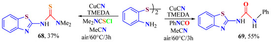 - Castanheiro, T.; Suffert, J.; Gulea, M.; Donnard, M. Aerobic Copper-Mediated Domino Three-Component Approach to 2Aminobenzothiazole Derivatives. Org. Lett. 2016, 18, 2588–2591. [Google Scholar] [CrossRef]