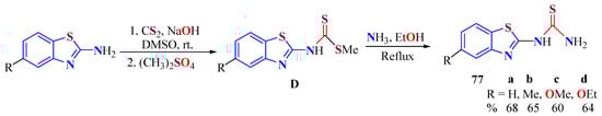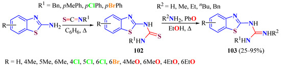 - Bhargava, P.N.; Lakhan, R. Synthesis of Benzothiazolylguanidines as Antituberculars and Antibacterials. Agr. Biol. Chem. 1968, 32, 1392–1394. [Google Scholar] [CrossRef]