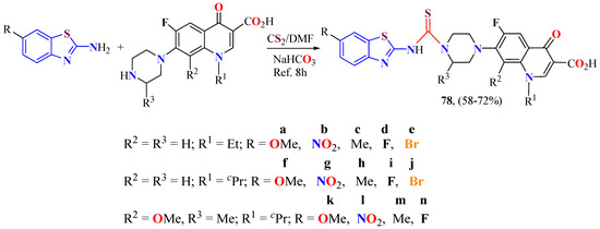 - Sharma, P.C.; Jain, A.; Yar, M.S.; Pahwa, R.; Singh, J.; Chanalia, P. Novel fluoroquinolone derivatives bearing N-thiomide linkage with 6-substituted-2-aminobenzothiazoles: Synthesis and antibacterial evaluation. Arab. J. Chem. 2017, 10, S568–S575. [Google Scholar] [CrossRef]